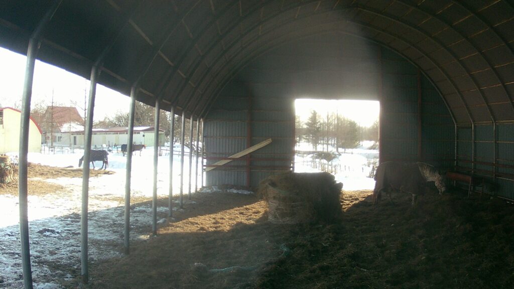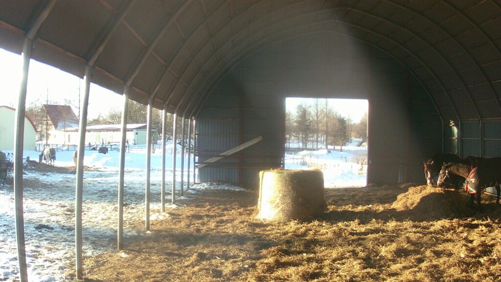 画像奥の出口近くにいるのは去年の新入りたち。他の馬たちはまだ手前の乾草のそばやシェルター内でモグモグ。