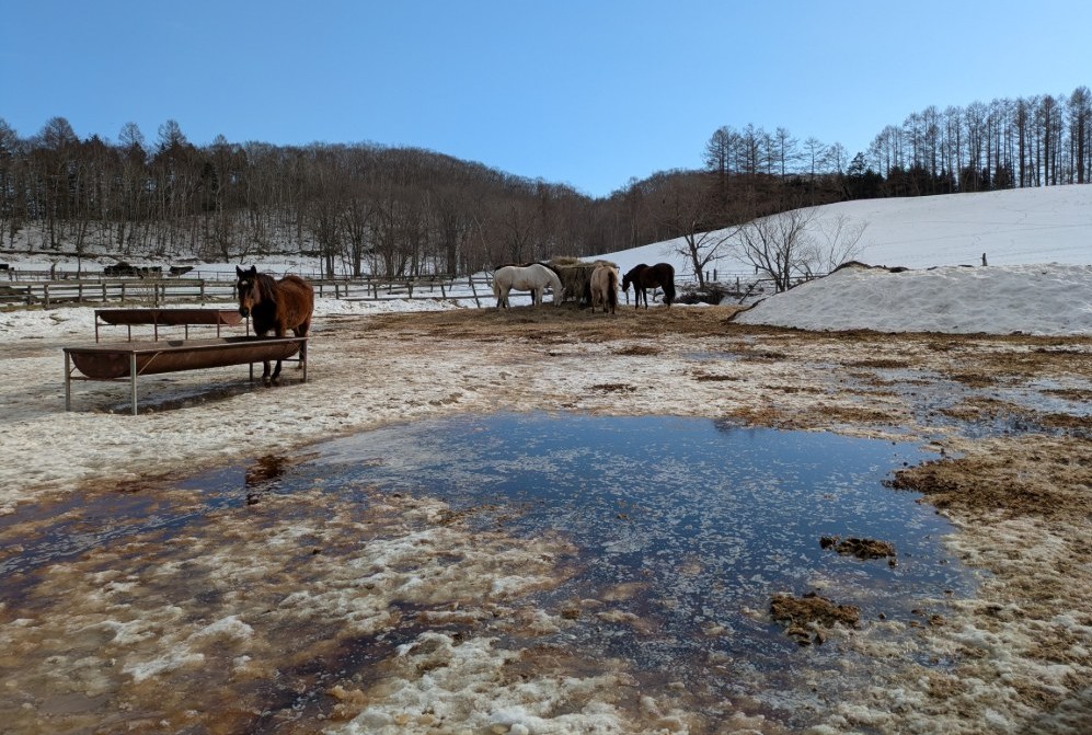 2月の標茶町は、暖かい日もあって雪はずいぶん少なくなりました。暖かいとはいえ、まだ気温は10度以下、夜になれば氷点下です。春を前に雪どけで足場も悪く、馬たちにも、もう少し春待ちが続きます。