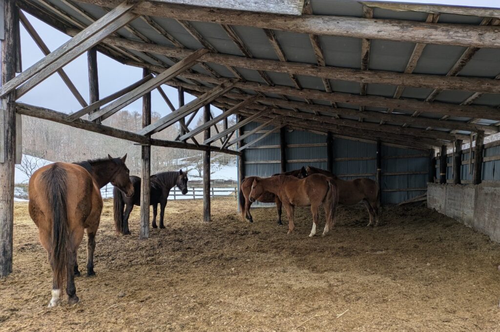 この日は終日曇天で寒かったので、風をよけて屋根下でじっとしていた馬たち。
