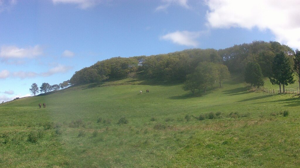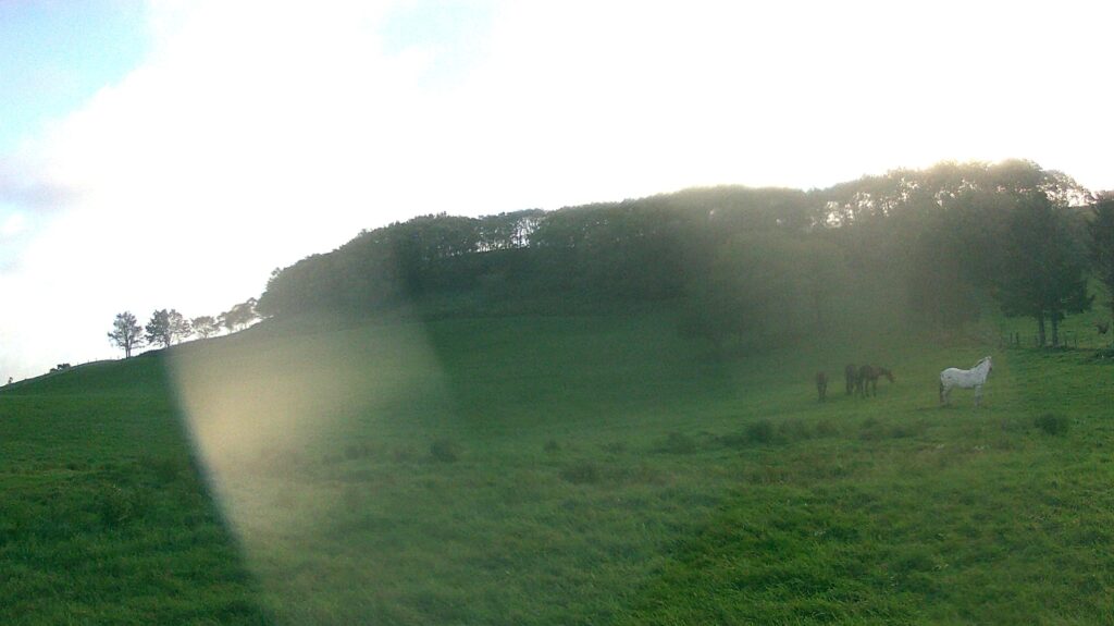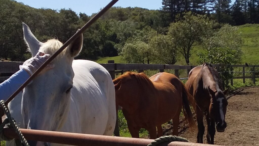 セントラル牧場でも、厩舎飼い(日中はパドックで放牧)の引退馬も共同放牧(昼夜ともパドックで放牧)の引退馬も、暑い間は馬房やパドックのシェルターの中で過ごすことが多かったのですが、最近はずっとお日様の下で、のんびり干し草を食べています。