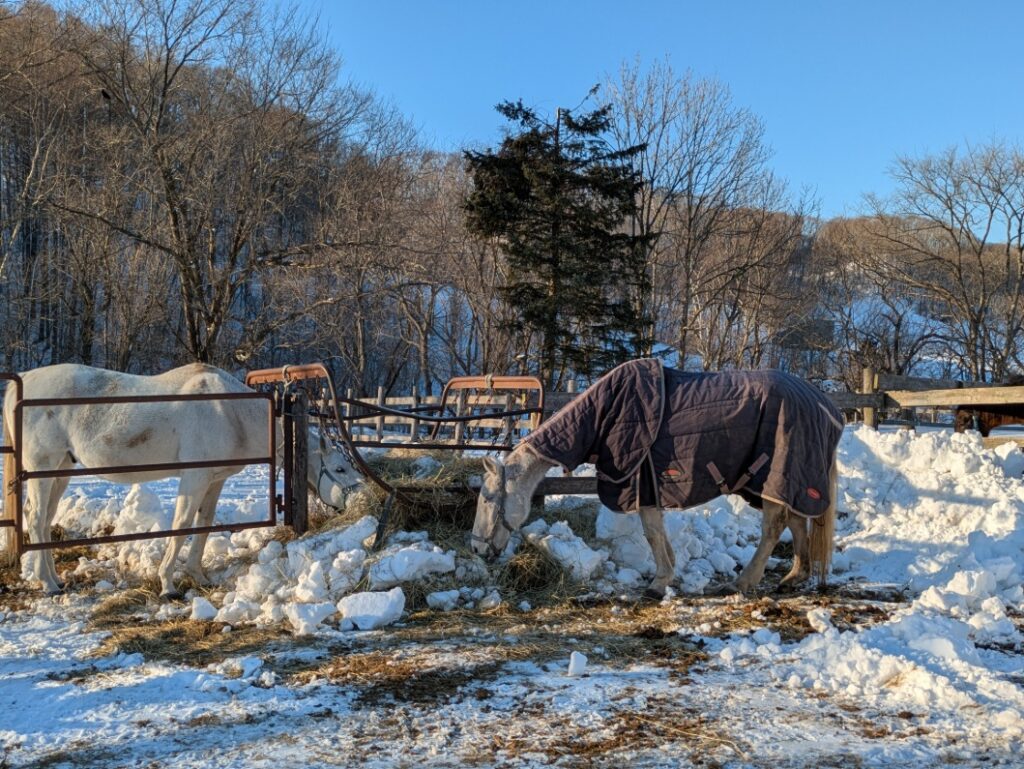 いきなりの大雪と寒さで、引退馬たちはどうしているかと牧場に様子を見に行きました。