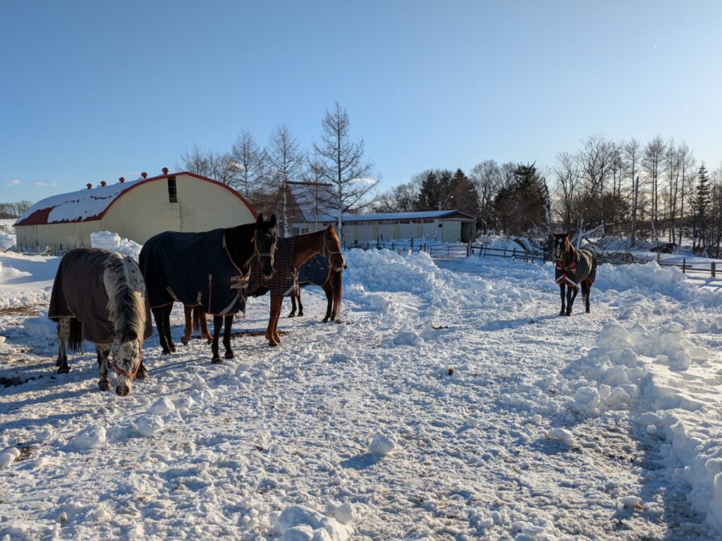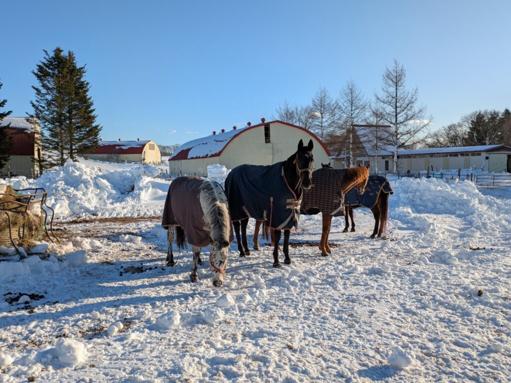 一方、釧路セントラル牧場の引退馬たちはすでに標茶町での暮らしも長く、冬も何度も経験しています。年のせいか寒さが苦手になってきた馬もいますが、牧場でも特に高齢馬には気を配って様子を見守っているとのことでした。